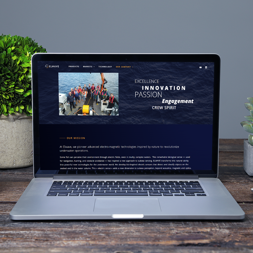 Conception UX & UI Design du site web Elwave. Création d’un site vitrine dynamique et élégant, pour mettre en valeur l’entreprise et les différentes utilisations de sa technologie CEDAR et ses produits E-pulse et E-sense.